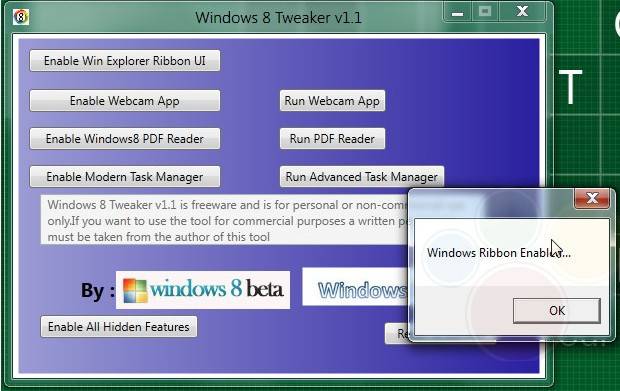 Izrādās, ka Microsoft šoreiz nolēmis nolēmis slēpt jaunievedumus no svešām acīm – vismaz no tām, kas daudz nejēdz no IT sfēras. Visticamākais, ka šis process turpināsies no builda uz buildu vismaz tik ilgi, cik tas būs iespējams. Lai atvieglotu darbu tautas testētājiemWindows 8 Tweaker 1.1ribbon