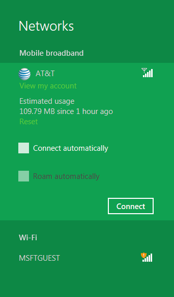Windows 8 vidē viss būs pavisam citādi: vienotā lietotāja saskarnē tiks apvienoti gan Wi-Fi, gan 3G tīkla savienojumi. Līdzīgi kā tālruņos, OS vispirms centīsies pieslēgties Wi-Fi, bet ja tas nebūs iespējams, tad pieslēgsies platjoslas mobilajam tīklam.