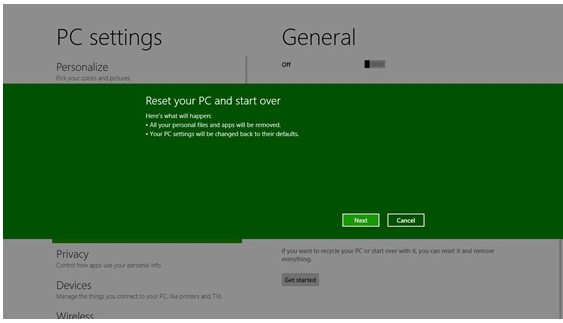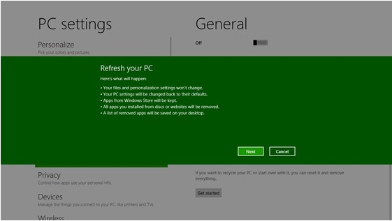 Š ī ir mazāk radikāla funkcija, kura noderēs, ja vajag pārinstalēt piedrazotu Windows. Funkcija neprasa rezerves kopiju veidošanu uz ārējā datu nesēja, pie tam tiek saglabātas Metro programmas, gandrīz visi lietotāja dati un iestatījumi.