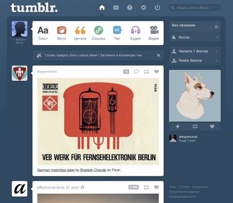 Tumblr ir pakalpojums, kas aptver vairāk nekā 100 miljonus blogu, kurus izveidojuši 54 miljoni reģistrēto lietotāju. Tajā ikviens var atvērt blogu, papildināt un rediģēt to, pievienot fotogrāfijas vai video, komentēt. Servisam ir arī mobilās programmas Android, WP un iOS vidēm.