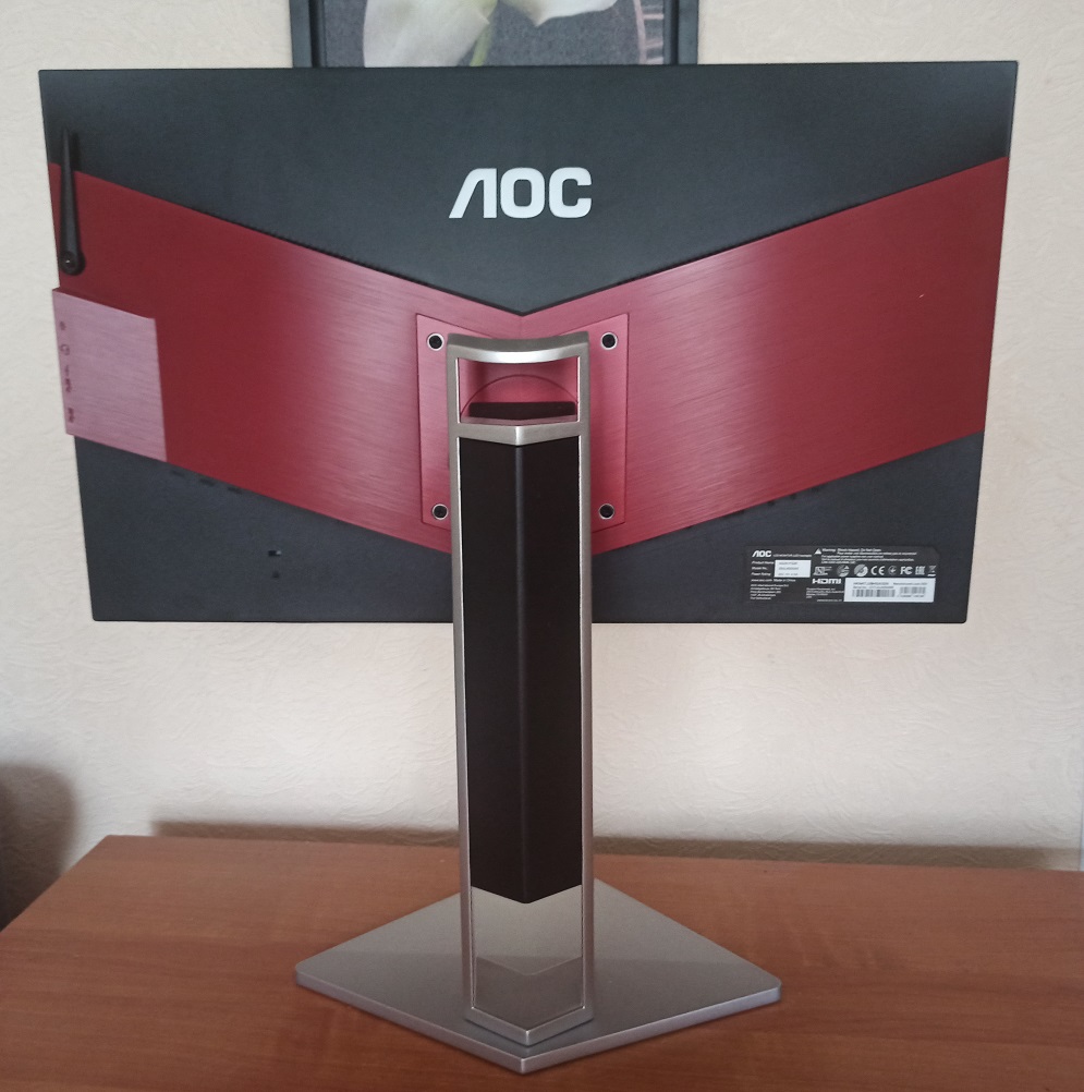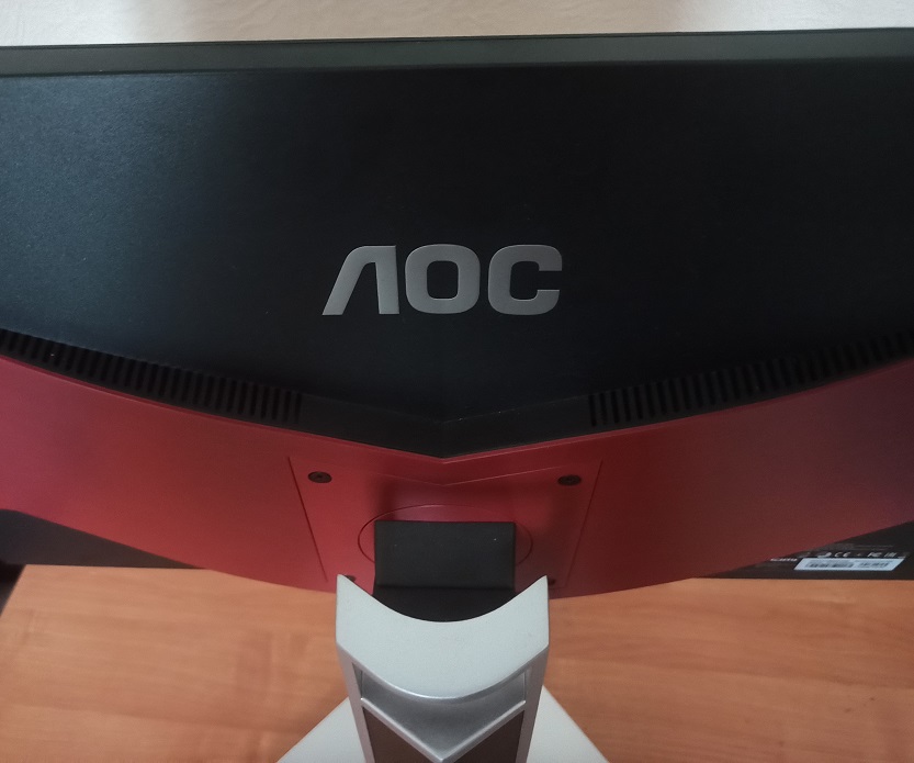 Runājot par dizainu, pats monitors ir no melnas plastmasas ar sarkaniem akcentiem. Sarkanie akcenti ir monitora priekšā AGON logo. Monitora aizmugurē ir izteiksmīgs sarkans panelis, kā arī diezgan liels AOC logo, kas gan ir no metāla vai alumīnija. Visai izteiksmīgs ir arī statīvs un statīva pēda, kas ir no metāla sudrabotā krāsā. Šī metāla konstrukcija palielina monitora kopējo svaru, taču metāla statīvs ir ļoti stabils un izturīgs. Statīvā ir caurumi kabeļu novadīšanai. Tas atbalsta augstuma regulēšanu līdz 130 mm. Regulēšanai personīgi gribējās, lai monitoru var nolaist pat nedaudz zemāk, jo no monitora un galda virsmas paliek diezgan liela atstarpe. AOC Q27G2U šajā ziņā bija iespējams noregulēt diezgan zemu pret galda virsmu.