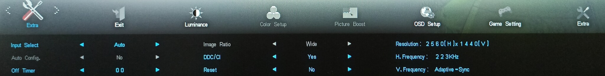 Kā jau iepriekš minēju, tad zem monitora novietotās uzstādījumu vadības pogas nav tās ērtākās un parocīgākās uzstādījumu ievadīšanai, vismaz man perosnīgi tās likās neertas. Iespējams laika gaitā piešaujas un vairs problēmu ar pogu vadību nebūtu. Bet pati saskarne gan ir ļoti vienkārša un saprotama. Kā jau spēļu monitoram, tam pat ir saskarnē iespēja ieslēgt atsevišķu FPS rādītāju. Uzstādījumos ir atsevišķi iespējams noregulēt spēļu uzstādījumus. Monitorā ir iekļauti vairāki “Game Mode” sākotnējie iestatījumi; ‘FPS’, ‘RTS’, ‘Racing’, ‘Gamer 1’, ‘Gamer 2’ un ‘Gamer 3’. Tie maina dažādus iestatījumus, daži arī stiprina attēla asumu, piešķirot asāku izskatu. VA panelis nodrošina 121% sRGB pārklājumu, kā arī panelis nodrošinās spilgtu un precīzu krāsu attēlojumu. Ekrāna spilgtums ir 250 niti.
