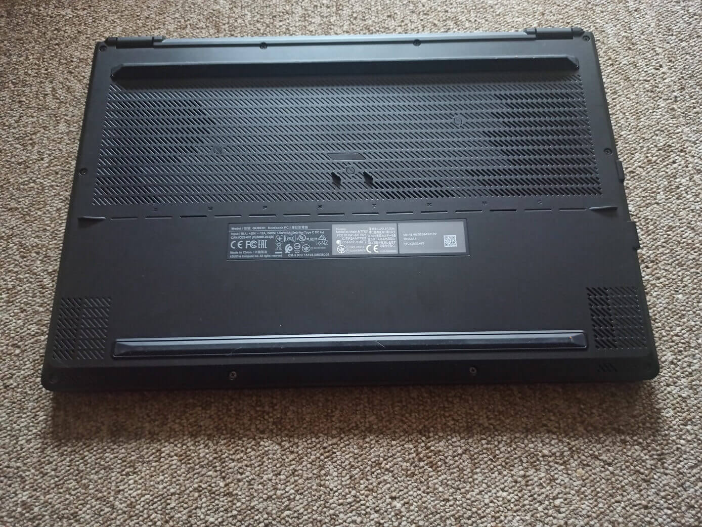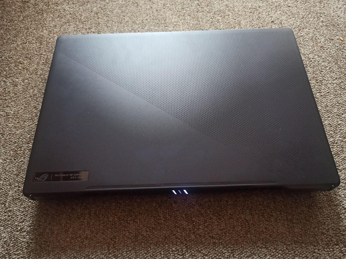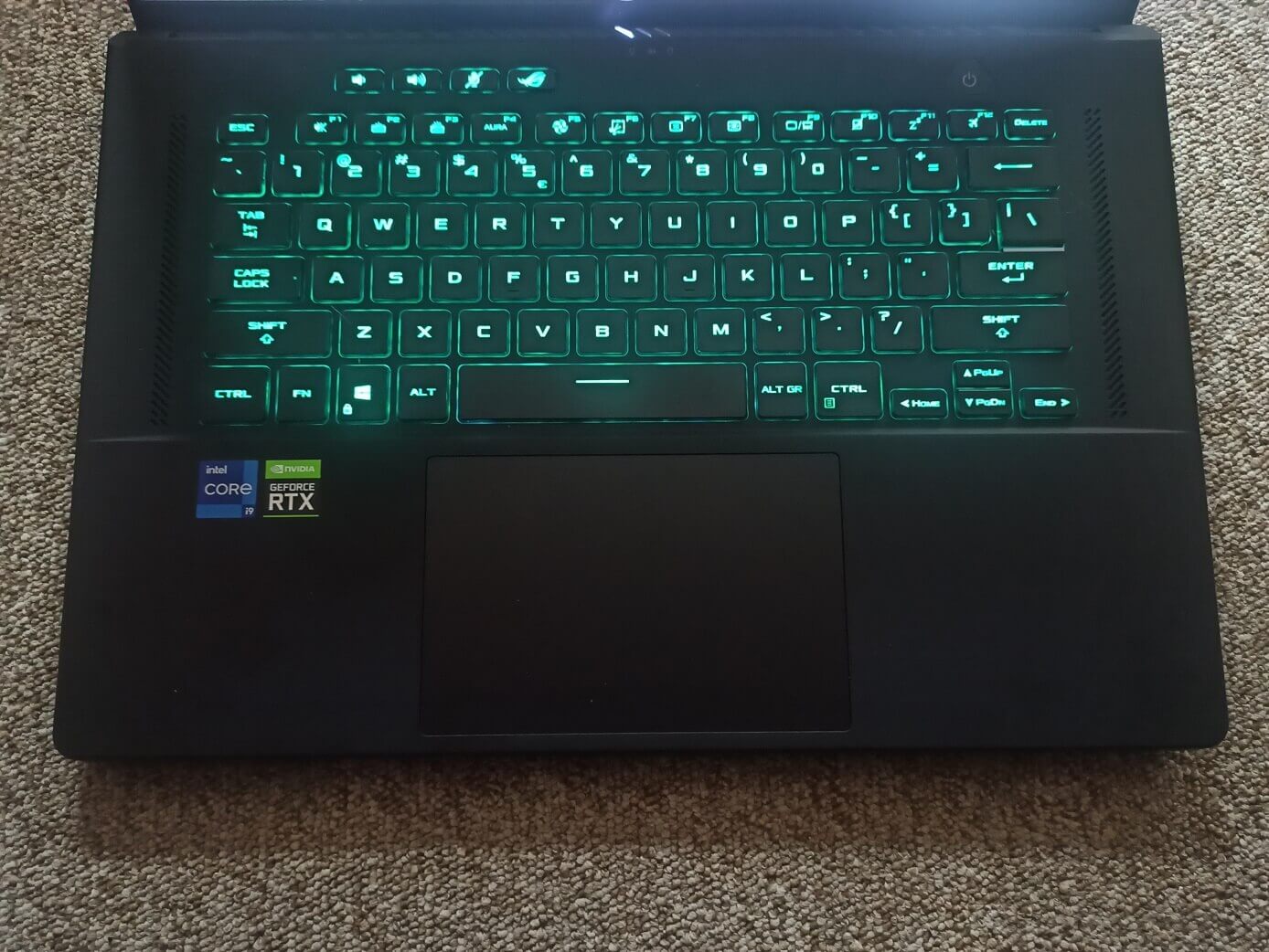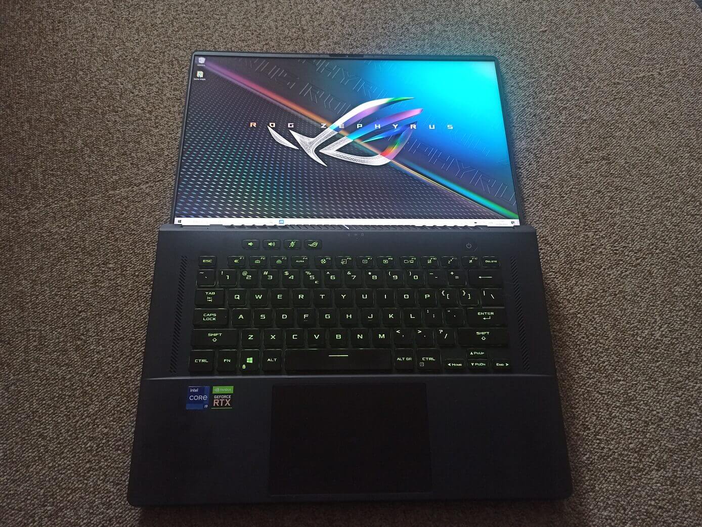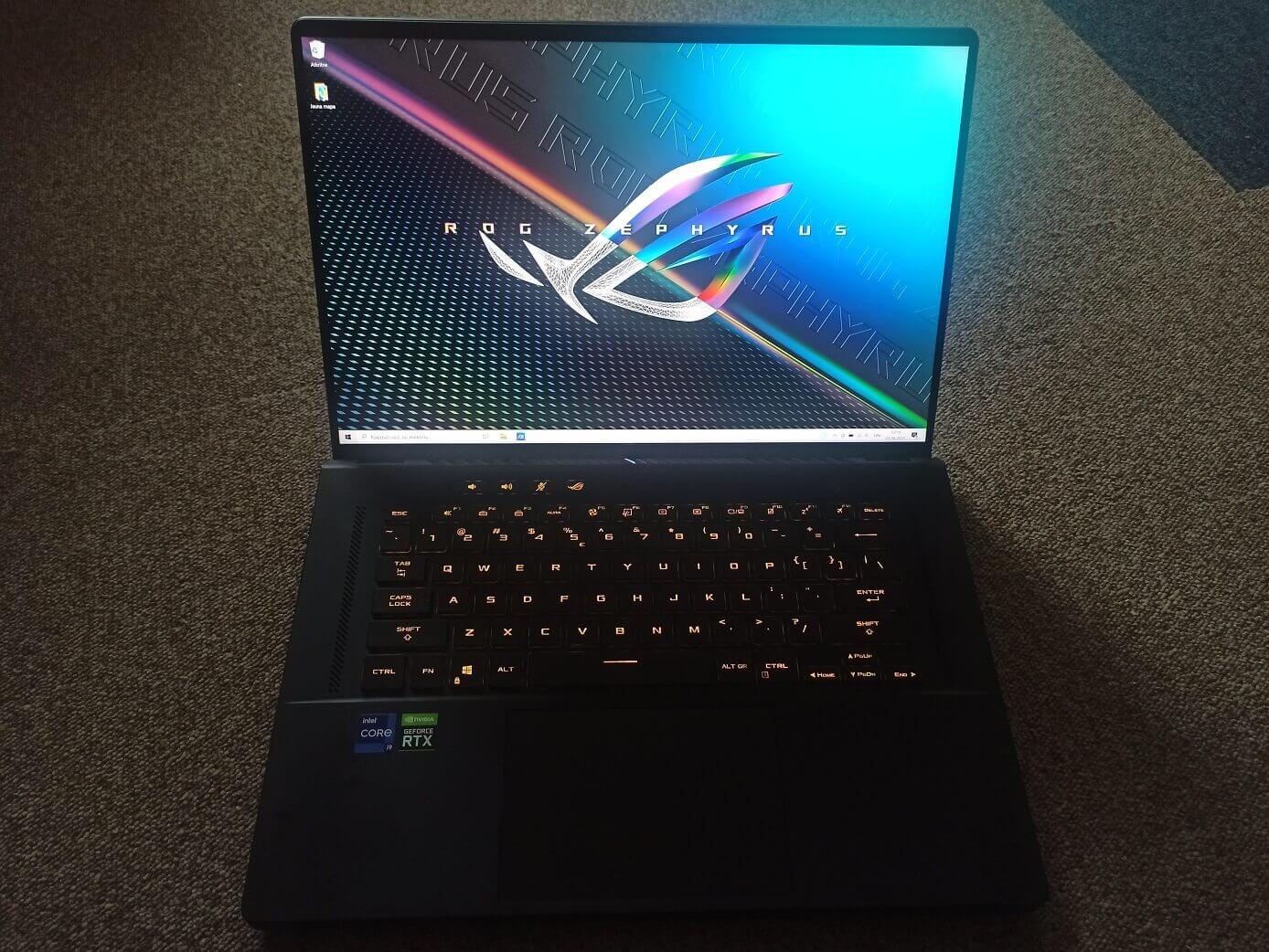 Atverot vāku, ir patīkami redzēt displeju ar ļoti šauriem rāmjiem. Pateicoties tam ASUS ir izdevies 15 collu šasijas datorā iebūvēt 16 collu displeju. Augšējā displeja rāmī ir iebūvēta arī video kamera. Displeju ir iespējams atvērt līdz pat 180 grādiem (nezinu kam gan tas vajadzīgs, bet nu, lai tā būtu). Atverot displeju, aizmugurējie dzesēšanas kanāli ir tieši pretī displejam, kas man personīgi īsti nepatīk. Tastatūra arī šim klēpjdatoram būtu parocīgāka, ja būtu pilnā platumā. Jāsaka, ka, rakstīt šo aprakstu uz šīs tastatūras bija visai neērti. Protams, pašas pogas ir nostrādātas kvalitatīvi, bet to izkārtojums ir salīdzinoši neparocīgs. Virs standarta tastatūras, kā jau ROG sērijas modeļiem pienākas, ir atsevišķas skaļuma regulācijas pogas un poga, ar kuru atvērt Armoyry Crate programmu. Pati tastatūra ir ar RGB krāsām izgaismota un regulējama. Ieslēgšanas / izslēgšanas poga arī ir virs tastatūras, bet šajā pogā nav iestrādāts gaismas indikators, līdz ar to poga, kad klēpjdators darbojas, pat ir diezgan nepamanāma. Tas ir nedaudz nepierasti, jo visiem iepriekšējiem modeļiem bija indikators, kas norādīja, ka klēpjdators ir ieslēgts. Skārienpaliktnis ir diezgan liels un tas ir centrēts korpusa vidū.
