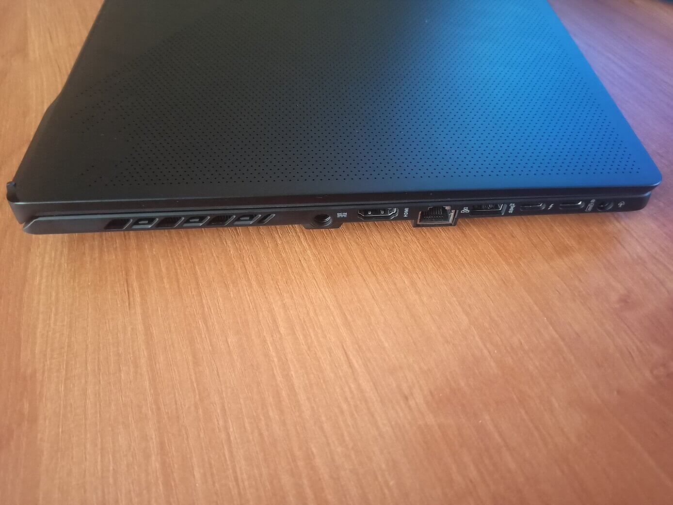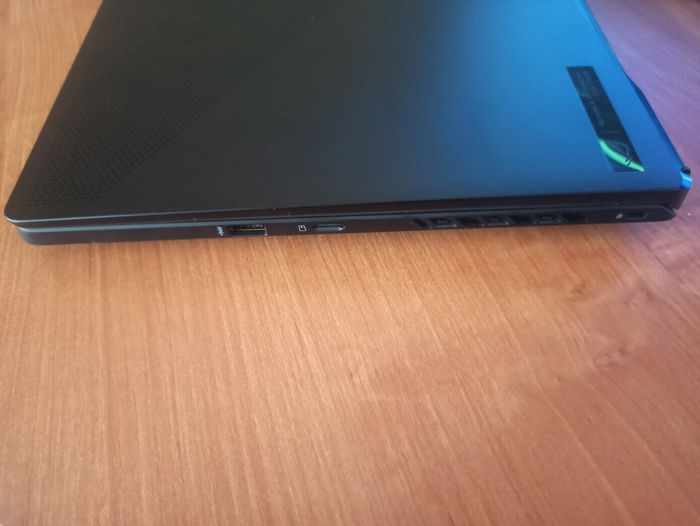 Zephyrus M16 ir plaša portu izvēle. Kreisā puse atrodas strāvas kontaktligzda, HDMI 2.0b ports, Gigabit Ethernet ports, viens USB-A 3.2 Gen 2 ports, viens Thunderbolt 4 ports, viens USB-C 3.2 Gen 2 ports (ar DP 1.4 un PD 3.0 atbalstu), 3.5 mm audio/mikrofona ligzda. Labajā pusē būs viens USB-A 3.2 Gen 1 ports, microSD karšu lasītājs, Kensington drošības slots. Gan labajā, gan kreisajā pusē būs arī dzesēšanas kanāli. Attiecīgi vēl divi klēpjdatora aizmugurē. Klēpjdatora pamatne ir stabila uz galda virsmas, pateicoties gumijas kājiņām, kas ir gan datora priekšpusē, gan arī aizmugurē. Aizmugurējā gumijas kājiņa ir ar diezgan lielu paaugstinājumu, lai datora pamatne būtu augstāk no galda virsmas un uzlabotu dzesēšanu. Arī pašā pamatnē ir caurumi, kas palīdz šo jaudīgo klēpjdatoru dzesēt ar gaisa plūsmu. Bet ar visu to, diemžēl, klēpjdatoram patīk uzkarst diezgan pamatīgi.