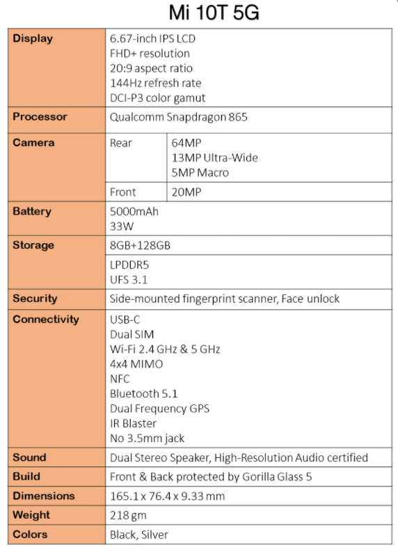 Tieši pirms izlaišanas ir noplūdušas Xiaomi Mi 10T un Mi 10T Pro specifikāciju lapas. Bija gaidīts, ka jaunākajiem Mi 10 viedtālruņiem būs Snapdragon 865 SoC un 144 Hz panelis, taču datu lapās ir atrodams vismaz viens pārsteigums. Saskaņā ar šo konkrēto noplūdi Mi 10T iegūst 8 GB RAM, kur iepriekš tika paredzēts tikai 6 GB. Lai gan šī ir vienīgā pieminētā parastā modeļa versija, gaidāmā 5G viedtālruņa Pro variants acīmredzot būs divās konfigurācijās: 8 GB + 128 GB un 8 GB + 256 GB.