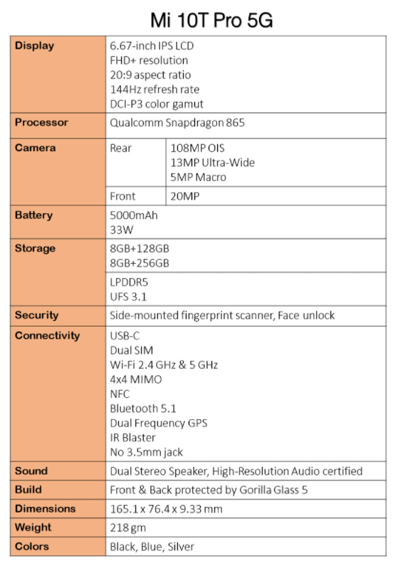 Citas atšķirības, kas uzskaitītas starp Xiaomi Mi 10T un Mi 10T Pro ir galvenais kameras sensors (64 MP pret 108 MP ar OIS) un krāsu izvēle: Mi 10T būs sudraba vai melnā krāsā. Savukārt Xiaomi Mi 10T Pro būs melnā, sudraba vai zilā krāsā.